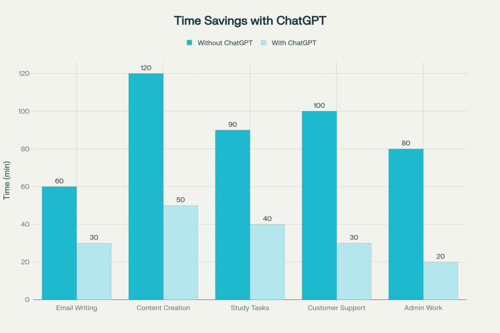 A: Users report time savings ranging from 30-70% depending on the task. Email writing often sees 50%-time reduction, content creation, 40-60% reduction, and routine administrative tasks for 60-70% reduction.